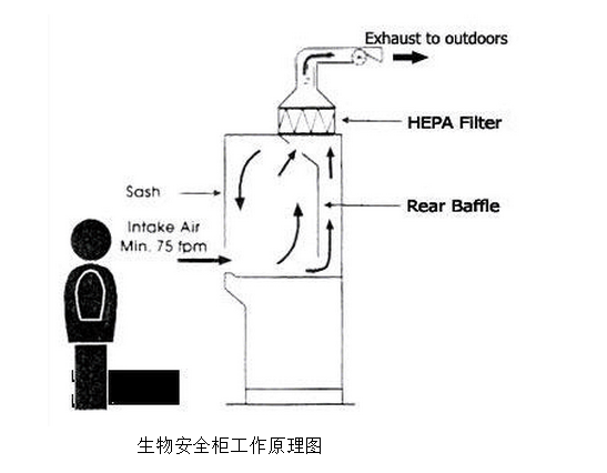 生物安全柜的顶部漏器上,从排风量上可以分为,50%外排型,75% 以及100%外排型。在生物安全柜内所形成的几乎没有微生物的环境中,尽量避免使用明火,酒精灯的火焰可能会影响室内的气流平衡。 以下是工作原理图:.