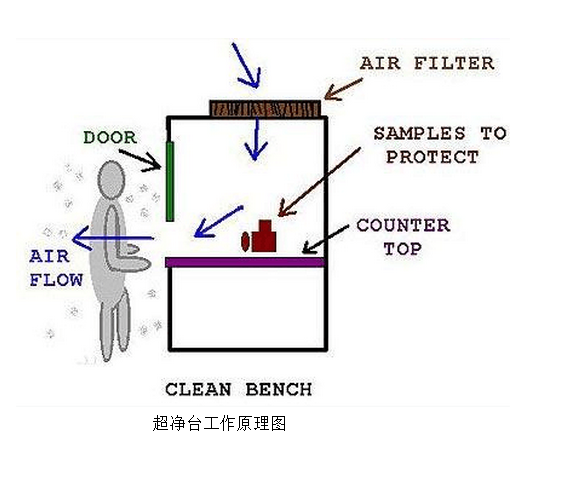 超净台是做一般对人体没有直接伤害的常规细菌的操作实验,正压送风,工作台工作区域的气流形成为水平层流型。区内空气经初效过滤器过滤后,由风机压入静压箱,再经高效过滤器过滤,由此送出的洁净气流,以一定的均匀断面风速通过操作区将尘??帕4?,从而形成高洁净的工作环境。超净空气的流速为24~30m/min,这已足够防止附近空气可能袭扰而引起的污染,这样的流速也不会妨碍采用酒精灯或本生灯对器械等的灼烧消毒。